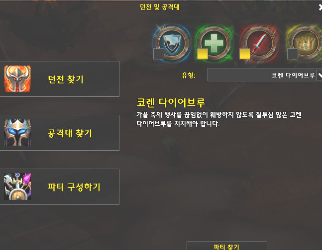 파티 찾기에 들어가서 '코렌 다이어브루'를 신청하면