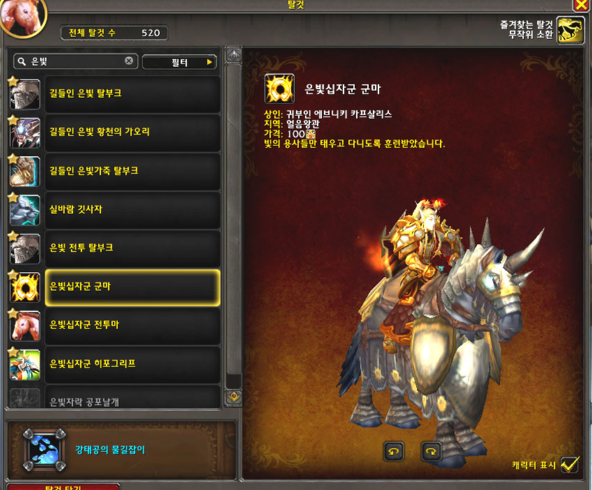 그중 은빛십자군 군마는 오직 성기사만 획득 가능합니다.