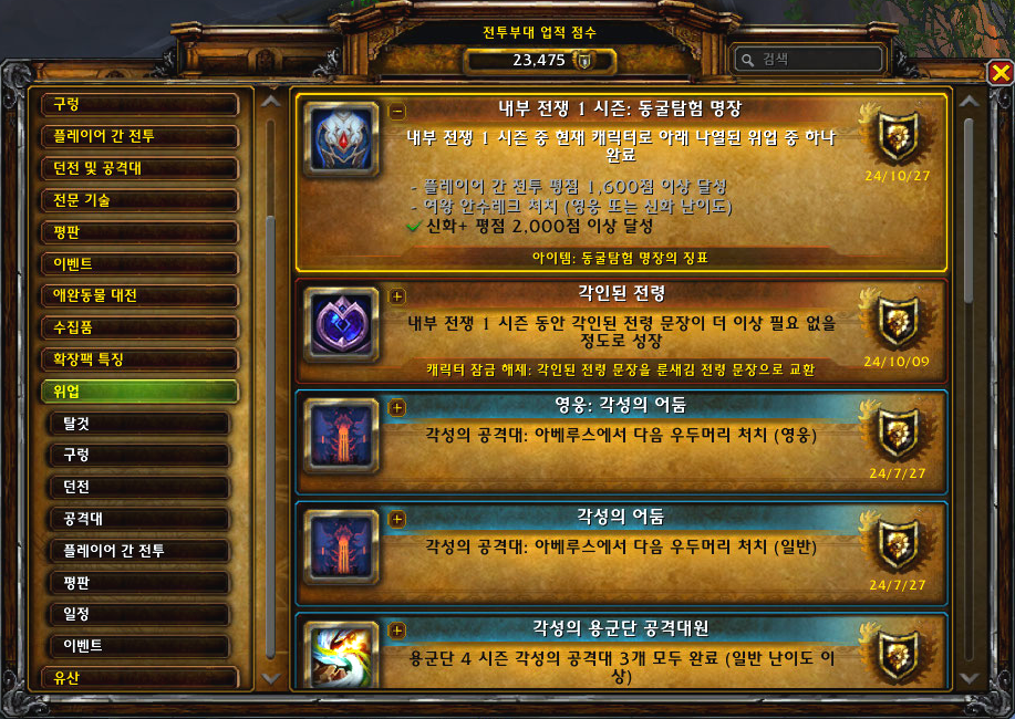 [내부 전쟁 1 시즌: 동굴탐험 명장 업적] 인데요,