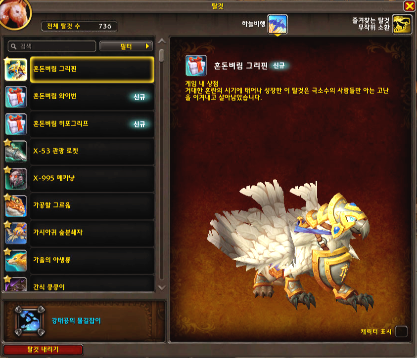 | [와우 탈것] 공작날개 히포그리프 (2) | 2024.10.25 |