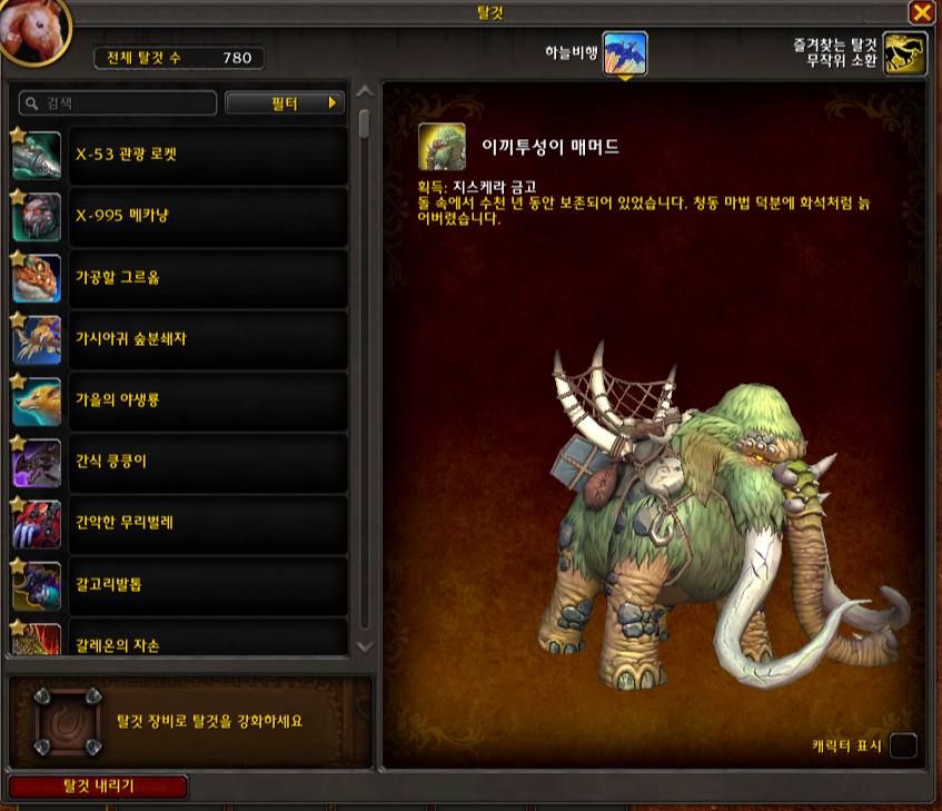 안녕하세요, 샤샤입니다!766번째 획득한 탈것은 선물로 받은 수색 매머드 입니다. 요즘 타이반 작업하는데천천히 해서 최근에 달성했어요. [배부른 자의 군대] 업적을 통해얻을 수 있는 탈것