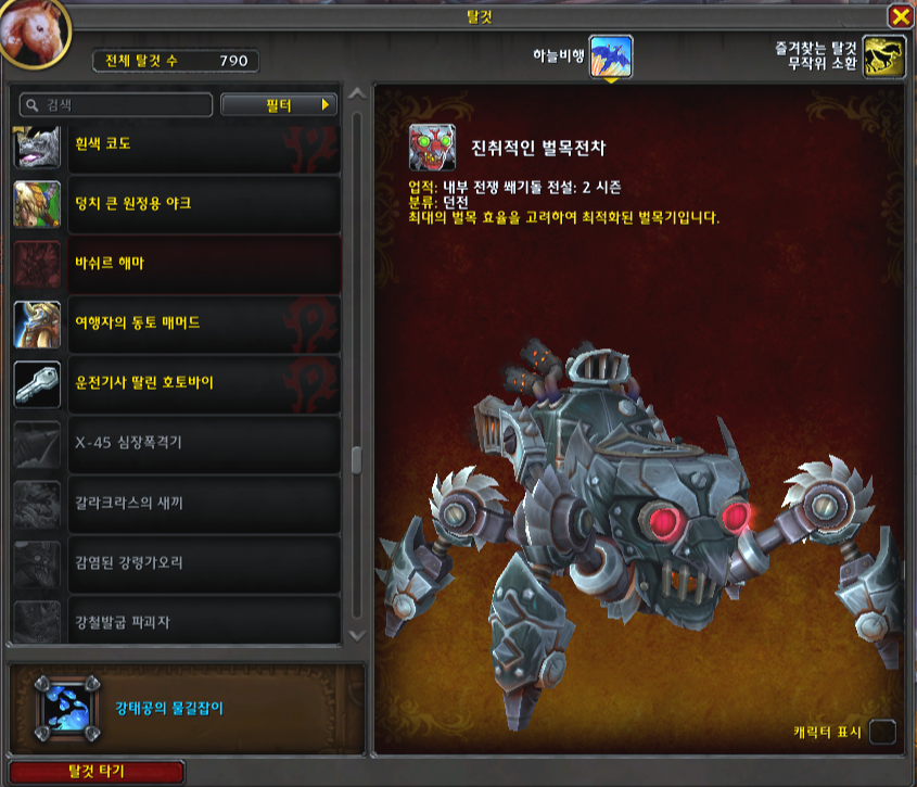 안녕하세요, 샤샤입니다. 776번째 획득한 탈것은진홍빛 벌목전차 입니다. 쐐기 업적인 [내부 전쟁 쐐기돌 장인: 2 시즌] 달성 시획득할 수 있는데, 쐐기 점수2,000점 이상이 되면 자동으로 달성됩니